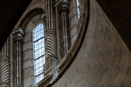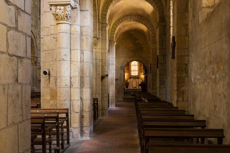 Anzy-le-Duc, France - August 1, 2018: Interior Historical romanesque church of Anzy le Duc with wooden benches and high pilars with capitals, Saonne-et-Loire, France.