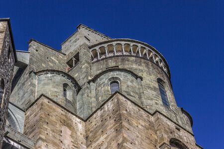 The Romanesque apse of Basilica Santa Maria Maggiore in Bergamo, Italy, showcases intricate architectural details, including arches and columns.