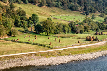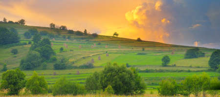 Mountain meadows and haystacks illuminated by morning light. wide photo.