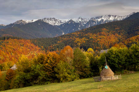 Picturesque autumn alpine landscape, amazing alpine village with gardens, haystacks and high snowy mountains in background near Bran, Magura, Transylvania, Romania, Europe