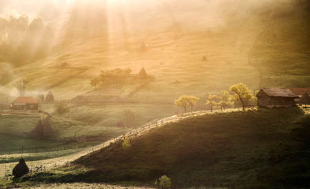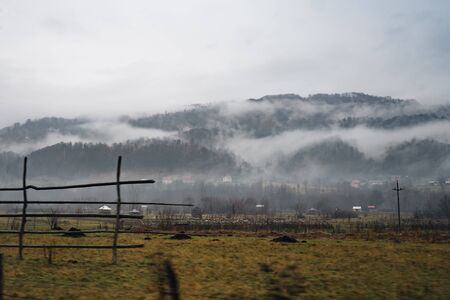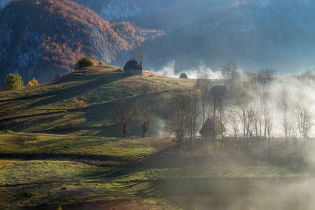 Rural landscape with fog in Sirnea – Fundata village, Transylvania landmark, Romania