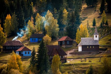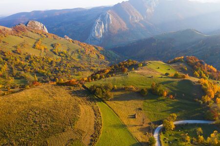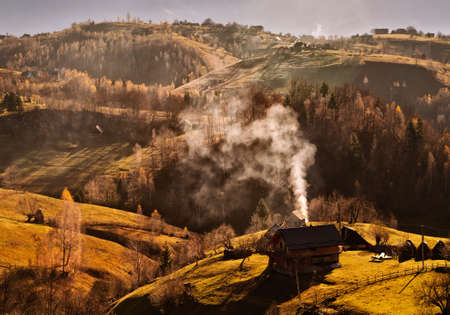 Aerial view of authentic traditional villages from Apuseni area in Romania during autumn sunset