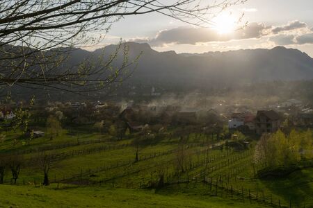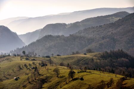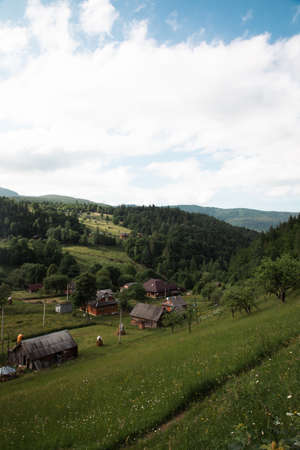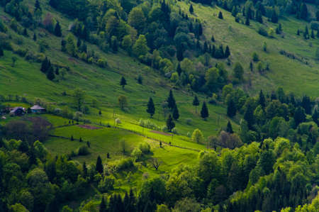 Rural mountain landscape with remote Romanian village uphill in the valleys of Carpathian mountains, in springtime