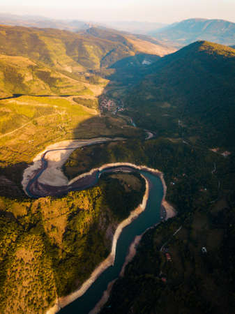 Aerial View Drone Flight over fantastic canyon mountain river. Dramatic autumn nature landscape. Green meadows, orange hills, pine tree forests against sunset sky. Carpathians, Ukraine, Europe.