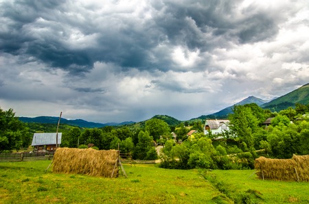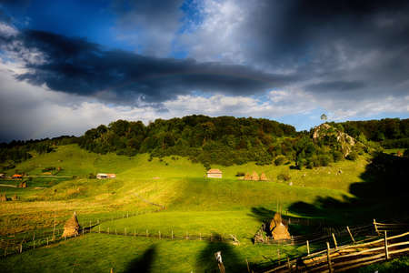 Countryside landscape in a romanian villlage at the food of Piatra Craiului Mountains.