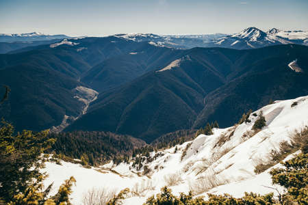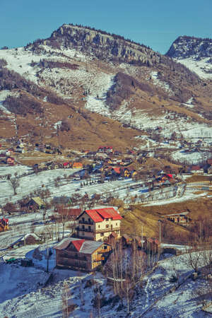 Wintry rural mountain scenery in the valleys of Bucegi mountains in Magura village, Brasov county, Romania. Touristic destinations for winter vacation.