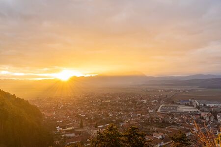 Landscape with aerial view of Rasnov town at sunset, Brasov, Transylvania, Romania
