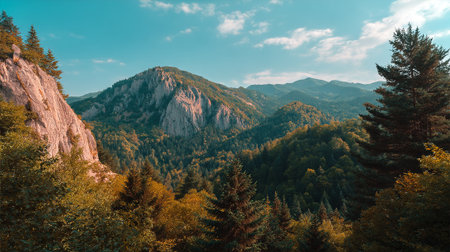Majestic Mountain Vista with Forested Slopes and Rugged Rock Formations