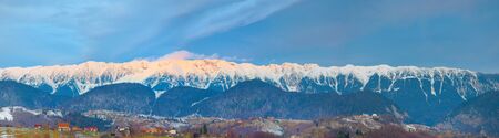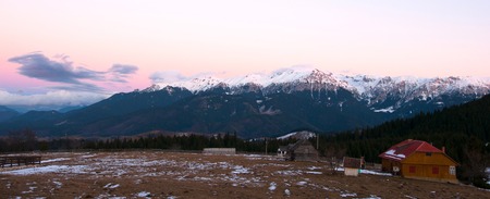 Picturesque rural landscape with snowy mountain ridge and vacation house, villa, pension during spring thaw uphill in Magura village, Brasov county, Romania. Travel destination and accommodation.