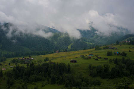 Fog and rain in the Carpathian mountains. Mountain village Dzembronya in the Carpathian mountains, Ukraine. Panoramic photo of mystical mountain landscape.