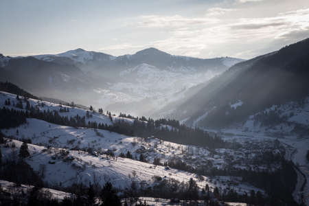 Carpathian mountains near Krivorivnya village Morning rays warm cold valley