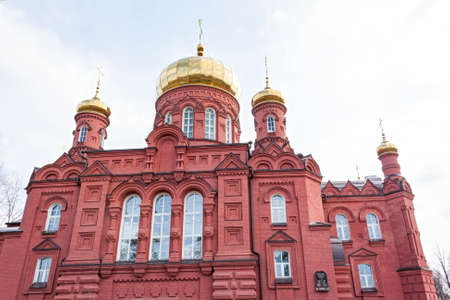 the old building of the Russian Orthodox Church in the city of Nizhny Tagil , red brick against the blue sky