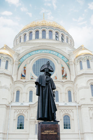 Summer views of the Nikolsky Sea Cathedral and the monument to Admiral Ushakov in the morning at dawn