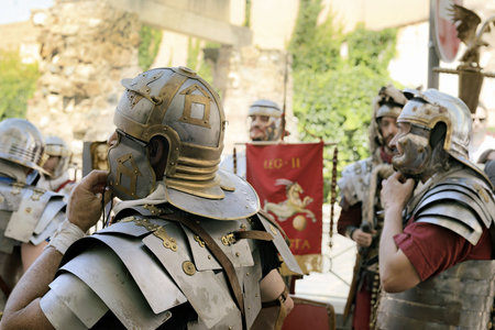Enthusiastic reenactors dressed as Roman legionaries perform at the Roman Forum in Merida, Spain. The detailed costumes and historical setting bring ancient Roman military life to the present day.