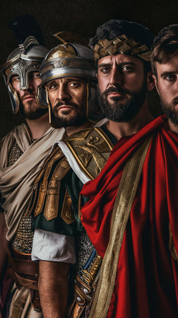 Photorealistic portrait of roman soldiers in armor. Biblical character. Historical character.