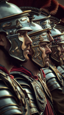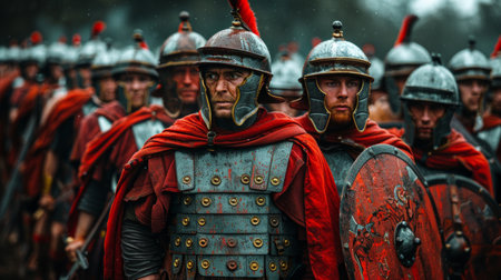 Roman soldiers clad in shining armor and helmets form an unyielding line, embodying the strength and discipline of the ancient military era.