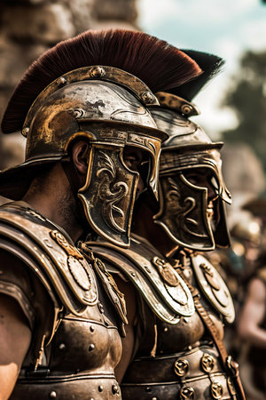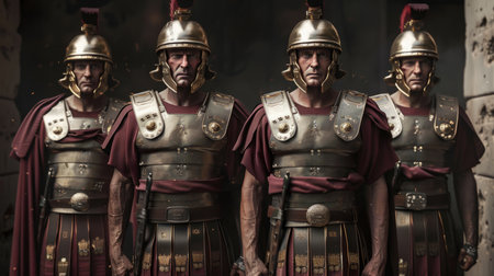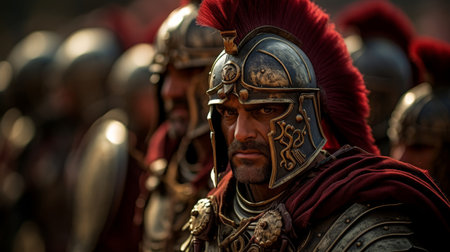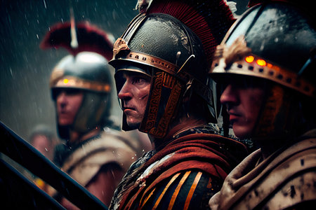 Photorealistic representation of Roman soldiers equipped with armor. Biblical figure. Historical figure.