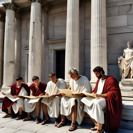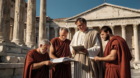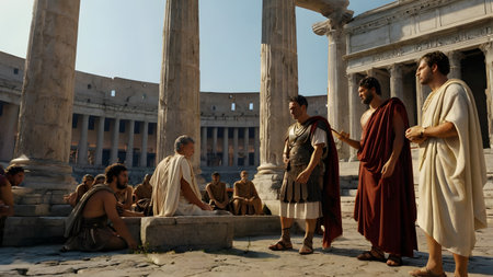 Ancient roman attire gathering with diverse adults in traditional robes at historical site