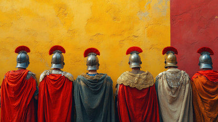 A group of Roman soldiers stands in formation showcasing their vibrant armor and capes against a striking yellow and red wall.
