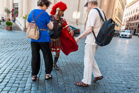 ROME, ITALY - JUNE 2, 2014: Gladiator impersonator near Colosseum entertains tourists to take photos with them