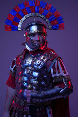 Powerful roman centurion posing against purple studio background