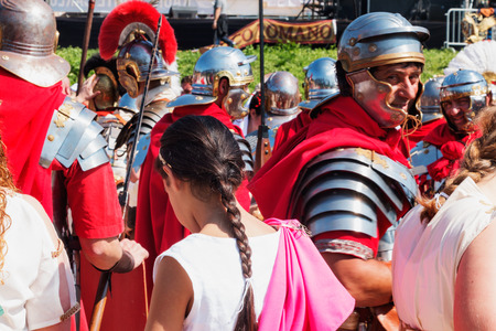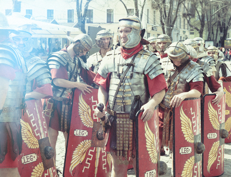Odessa, Ukraine - March 2018 Roman legion empire soldiers old armor, swords, shields, banners Show.