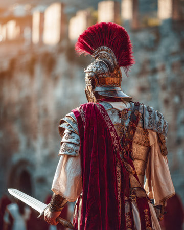 An elaborately decorated ancient warrior in intricate armor with a vibrant red crest and flowing cloak, poised with a sword, evoking strength and hero