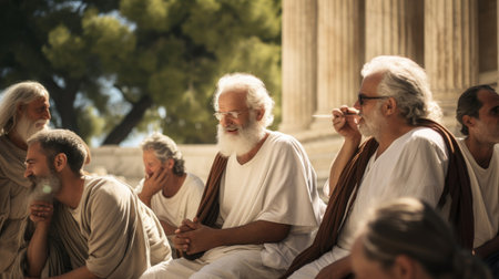 Philosophers debate in Athenian agora togas billowing