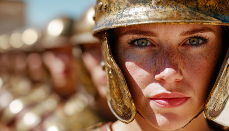 Roman soldiers standing in formation, showcasing detailed armor and helmets under sunlight.