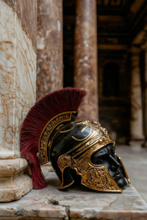 Ancient Roman helmet with red plume rests on marble