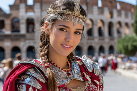 A person dressed in a detailed Roman outfit stands confidently at the Colosseum, radiating historical charm.