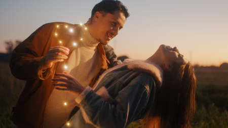 Happy young couple enjoying outdoors during sunset - Image