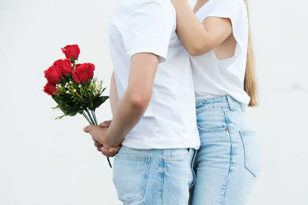 Closeup of young couple hugging and man holding flowers to give surprise to girlfriend at Valentine's day or anniversary.