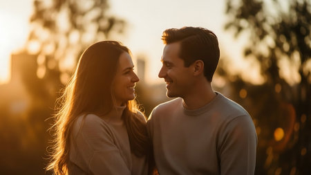 Close-up of a pair standing together, their features illuminated by the sun's embrace. AI generative.