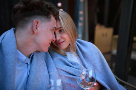 Young couple in love with wine resting outdoors on terrace in evening, weekend away in tiny house in countryside, sustainable living.