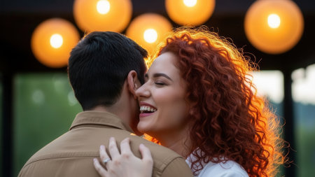 Close up portrait of a beautiful red head woman smiling and trying to kiss her boyfriend against sunset while dating outside.