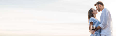 Two young lovers stand on the beach and look at each other against the backdrop of the sunset. Summer vacation concept while vacationing on a tropical beach. Baner.