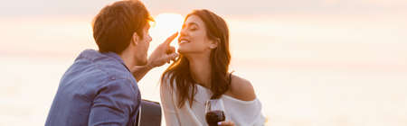 Panoramic shot of man with acoustic guitar touching nose of girlfriend with glass of wine near sea
