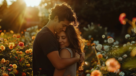 Couple embracing in a garden with blooming flowers background, during golden hour