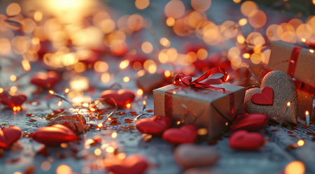 A stunning romantic scene featuring red roses and heart-shaped decorations. The soft bokeh lights create a warm and inviting atmosphere, perfect for love-themed events.