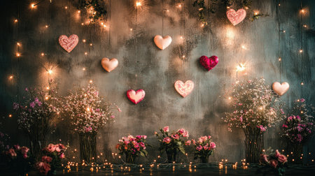 A beautiful romantic scene featuring an enchanting floral arrangement with heart decorations and glowing fairy lights, perfect for celebrations of love.
