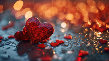 A captivating scene featuring red hearts and rose petals surrounded by sparkling lights. This image evokes romance and warmth, perfect for love-themed projects.