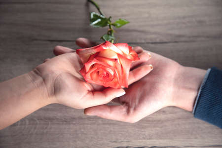 Closeup of young couple hugging and man holding flowers to give surprise to girlfriend at Valentine's day or anniversary.
