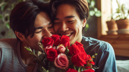 Happy asian gay couple hugging with bouquet flowers. Engagement celebration. Pride concept. Generative AI.