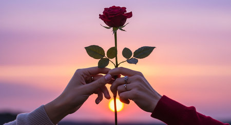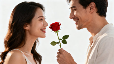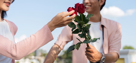 Joyful couple exchanging roses on Valentines Day capturing a loving gesture under a clear sky