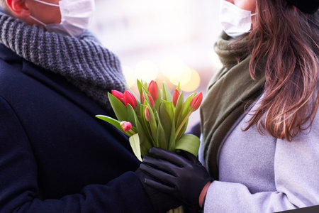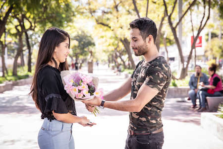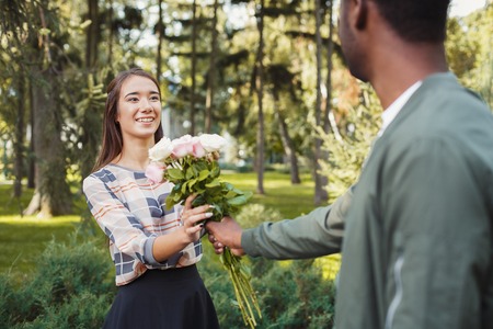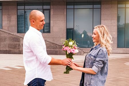 Male give bouquet of flowers to girlfriend outdoor. Happy couple together