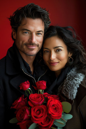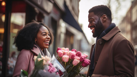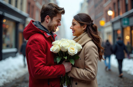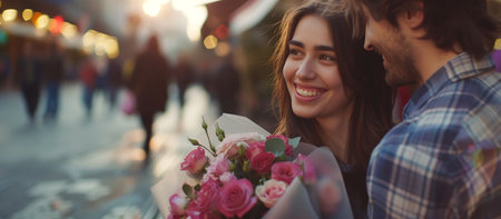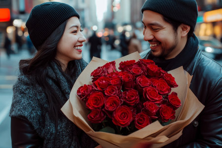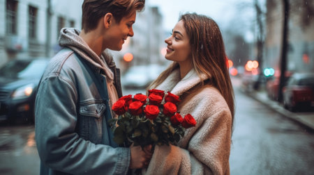 A joyful encounter couple sharing smiles and holding a bouquet of red roses on the street