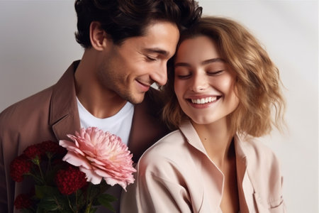 beautiful young couple in love girl model with a young man with a bouquet of flowers, international women's day, warm relationship care and attention, selective focus