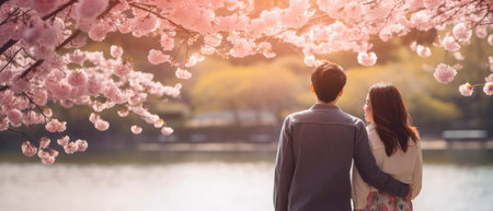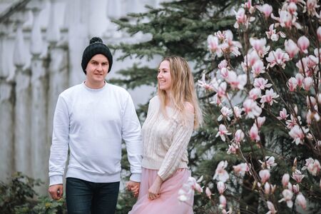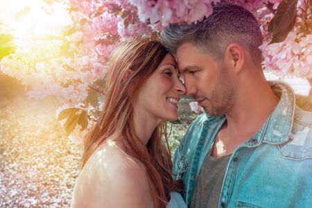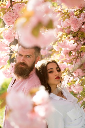 Man and woman standing under blooming branches on spring day. Couple stands near sakura trees. Couple in love spend time in spring garden, flowers on background, defocused, close up. Date concept.