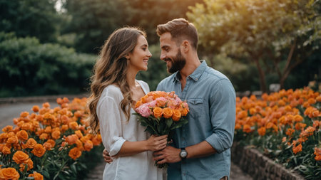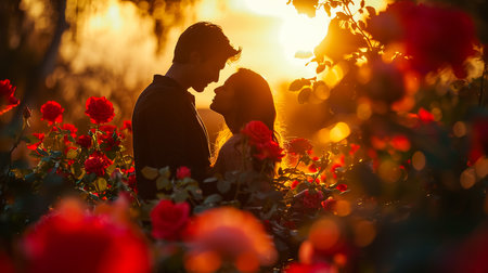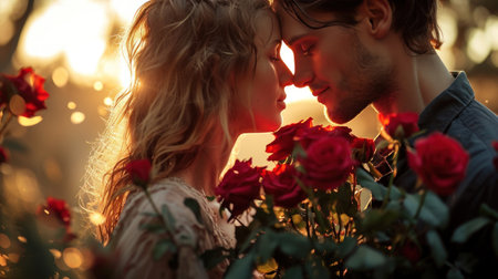 Romantic couple holding bouquet of roses in a vibrant garden during sunset